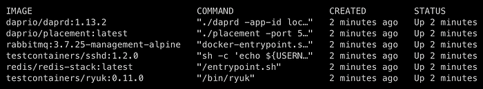 With the Dapr container correctly configured, the next step is to set up the container for Redis and RabbitMQ. These services will serve as the state store and pub/sub-messaging broker. Below is the code for initializing their corresponding Testcontainers: