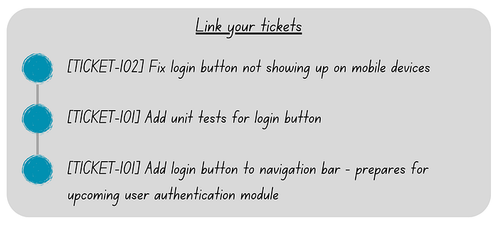 - Link to Relevant Issues: If your pull request resolves a specific issue, link it. In well-structured projects, there should be no commits that do not reference tickets in which the requirements are described in more detail. This not only provides context but also helps in tracking project progress.